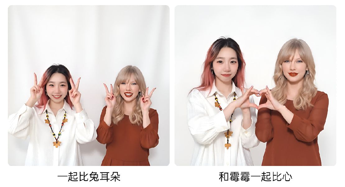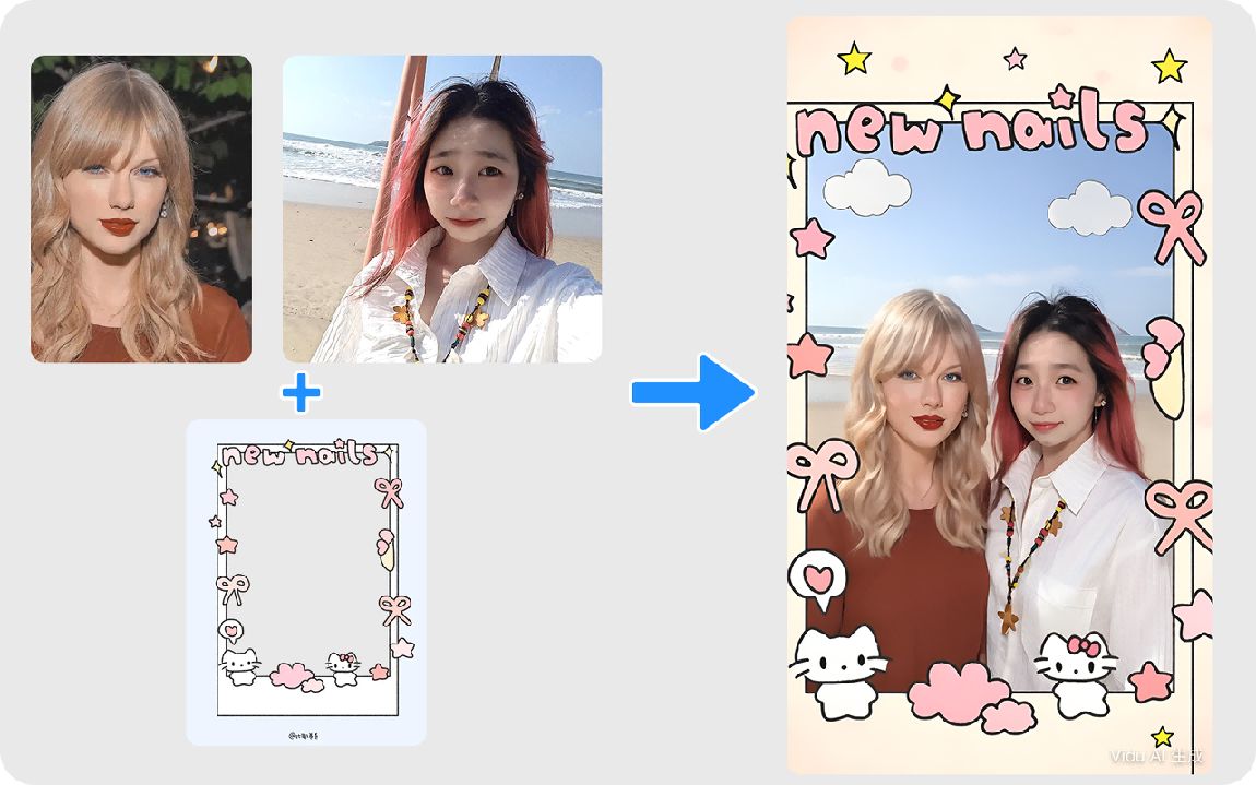 比如输入你和明星的照片和大头贴框,即可生成你和泰勒斯威夫特在海边的合影照,融合自然,仿佛是在某个海边拍的偶遇照片。