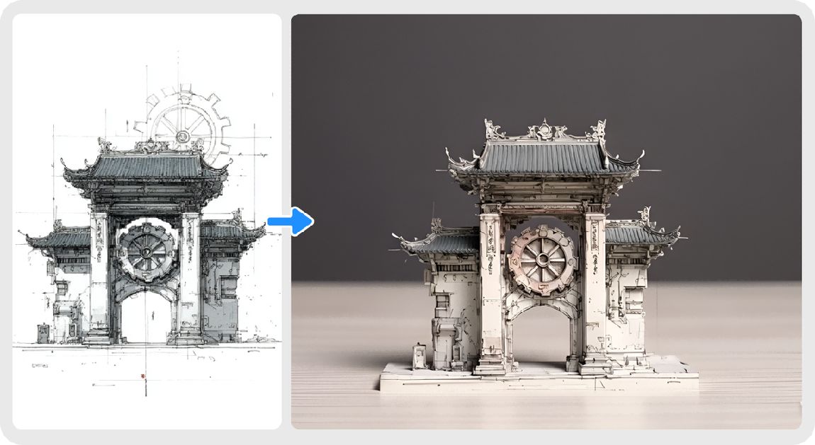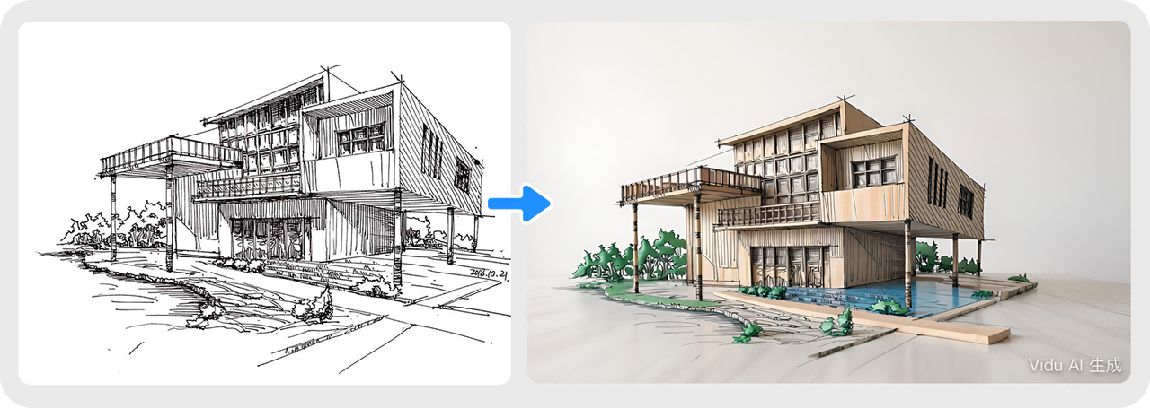 Vidu Q1参考生图能将复杂的建筑设计图,直接转化为3D立体模型图,建筑细节精准还原,省去复杂的建模流程。