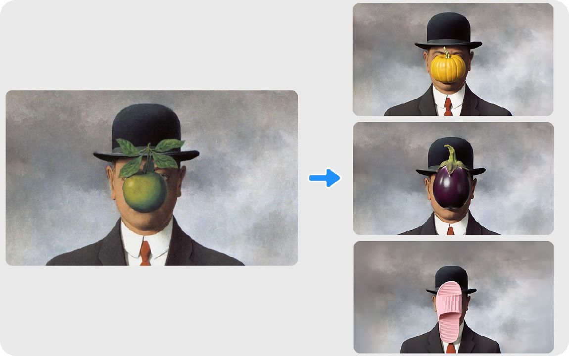比如利用Vidu Q1 参考生图将超现实主义画家雷尼·马格利特的名画《人类之子》的经典绿苹果替换成茄子、拖鞋、南瓜,生成一系列趣味组图。