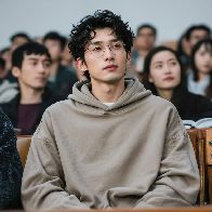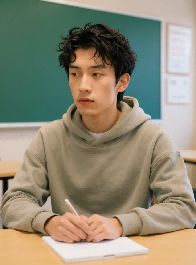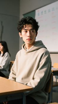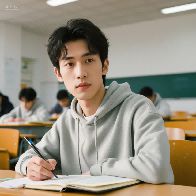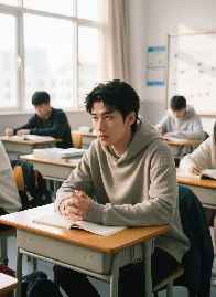 prompt:参考图中人物,修改背景为人物在班里座位上认真听课