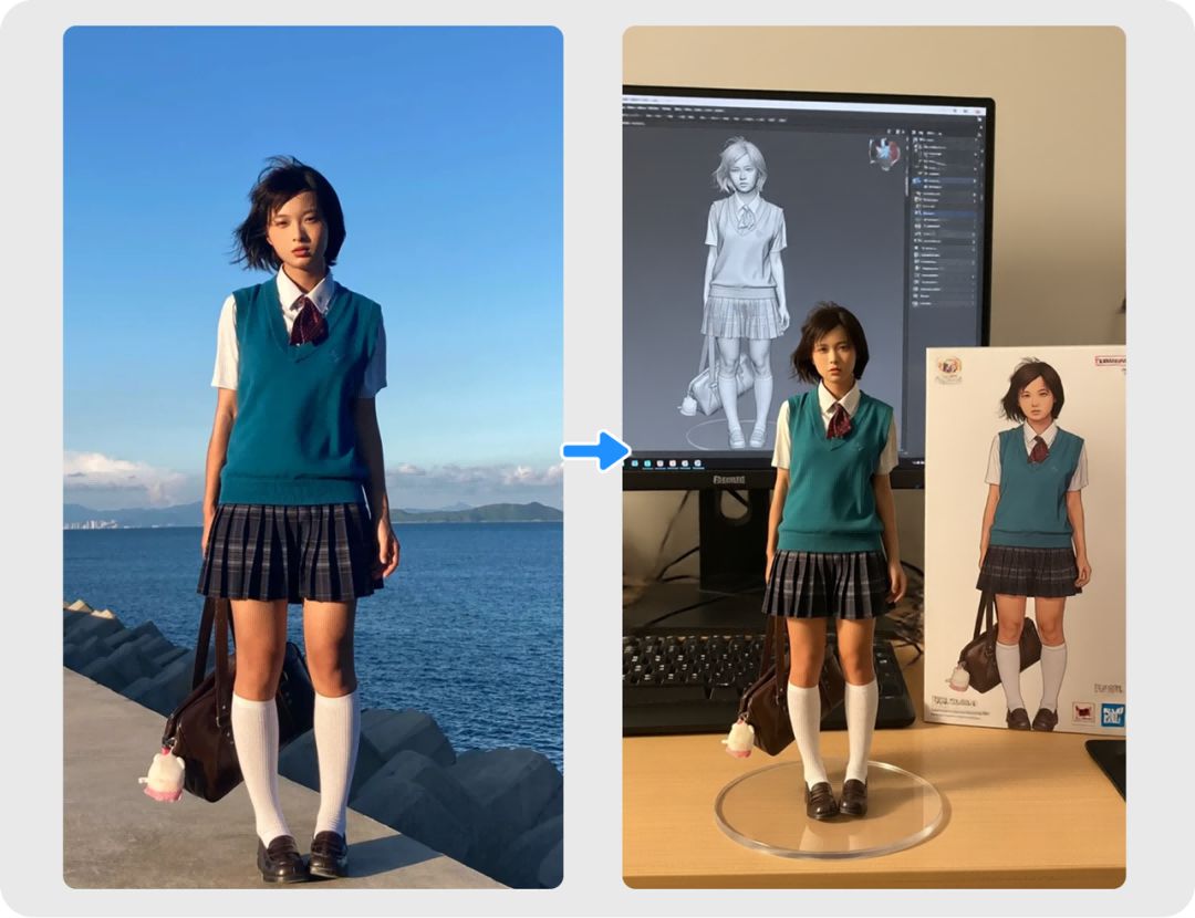 当然最近很火的手办玩法,Vidu Q1参考生图也能稳定发挥,不仅支持二次元转手办,还可以让真人直接变成桌面手办,与真人简直神同步。