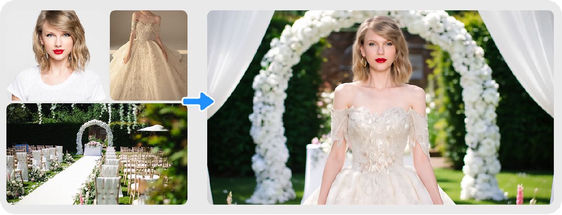 Vidu Q1参考生图也支持同时换装+换场景。比如用AI生成霉霉的结婚现场照。