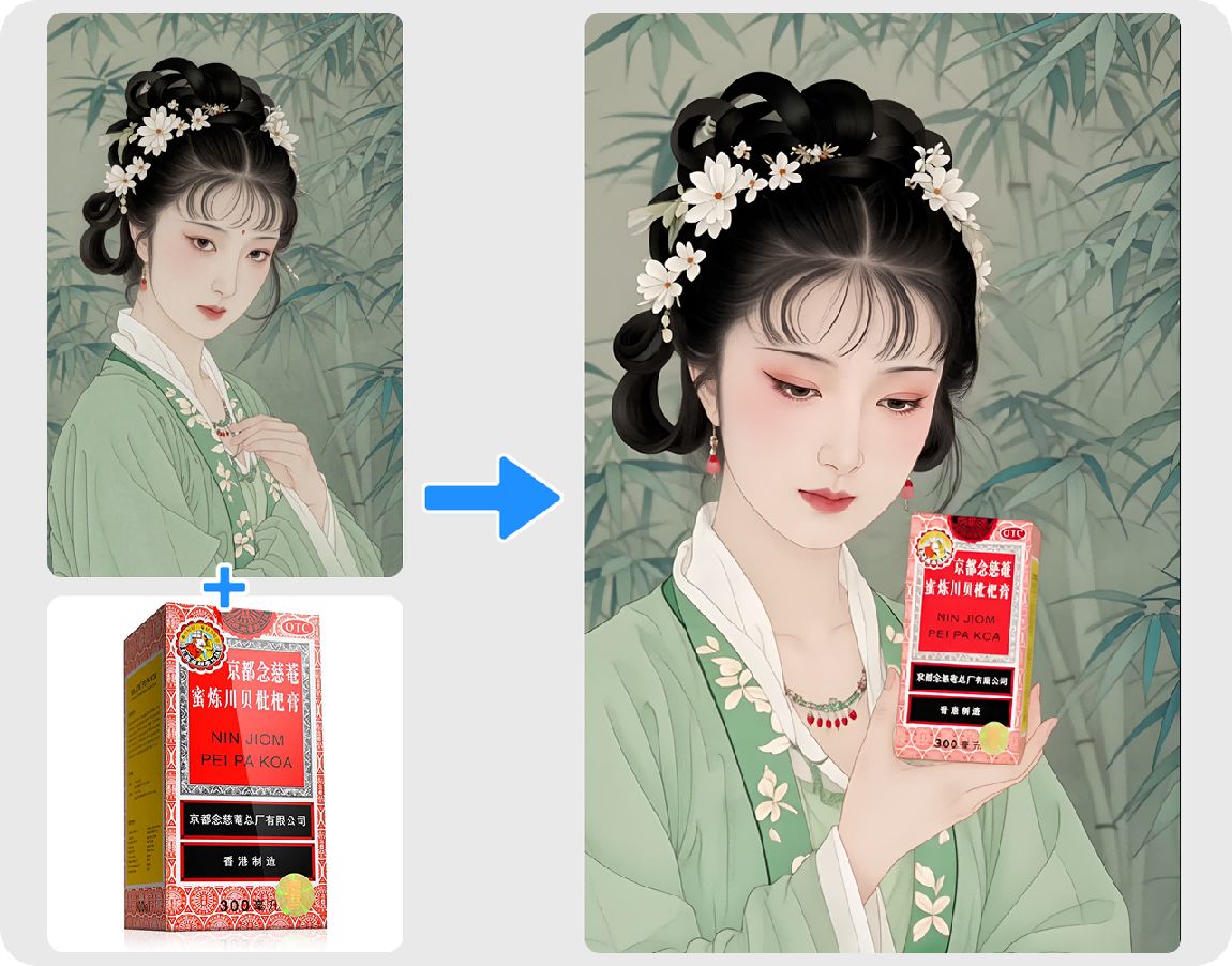 Vidu Q1参考生图还可用于创意营销的产品素材,比如让林黛玉代言川贝枇杷膏。产品包装的细节、颜色、质感都与原图保持完全一致,古代人物与现代商品间的互动,有种穿越古今的反差感。