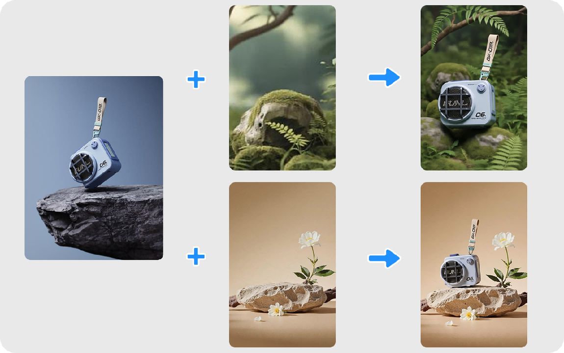 比如将图一的蓝色便携音响换成户外森林和岩石的背景,适配不同的季节,体现别具一格的生活品味。