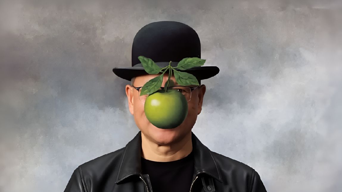 仍然以上图为例 ,将《人类之子》中的男人换成黄仁勋,保持背景不变。可以看到黄仁勋戴着《人类之子》中的帽子,穿着标志性的皮夹克,视野部分被绿色苹果遮住,完美复刻经典艺术画。