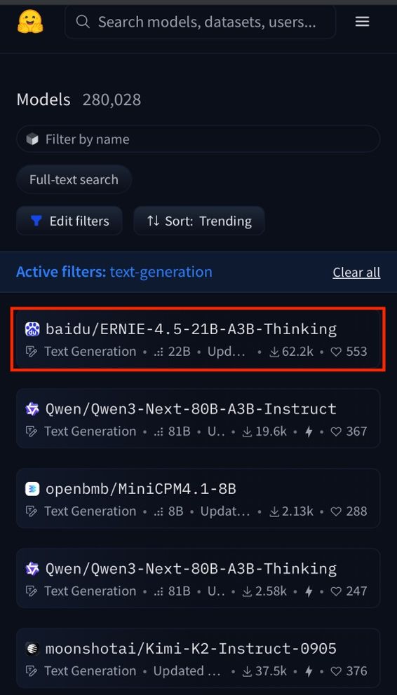 据 HuggingFace 官网最新数据显示,截至 2025 年 9 月 12 日,百度最新开源的文心思考模型 ERNIE-4.5-21B-A3B-Thinking在 HuggingFace 全球模型总趋势榜和文本模型趋势榜均排名第一。