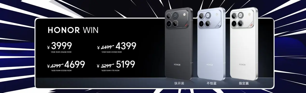 荣耀WIN与荣耀WIN RT拥有“快开黑”“指定赢”“不怕蓝”三款配色,起售价分别为3999元、2699元。首销期间,荣耀WIN 12GB+512GB、16GB+512GB、16GB+1TB版本,荣耀WIN RT 12GB+256GB、16GB+256GB版本限时优惠100元。