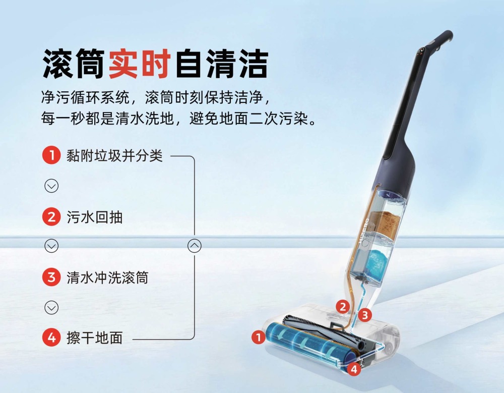这种技术模仿动物舌头的卷取动作,通过滚筒黏附干湿垃圾,并在内部实现固液毛的自动三分离。这意味着从根源上避免了传统洗地机垃圾混合易发臭、滚筒自清洁不彻底、吸力快速衰减影响效果等行业痛点。