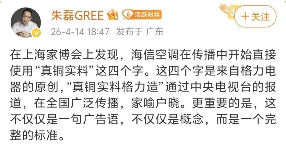 格力朱磊4月14日晚上发微博,说“真铜实料”这四个字是格力的原创,他们花大钱到处打“真铜实料”的广告,大媒体也报道了,所以其他企业和海信空调就不能用了,用了就是“公然剽窃”!