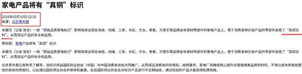 实际上,10年前的2016年3月,中国消费者协会和国际铜业协会(中国)共同发起“铜佳品质家电标识”,海信、创维、三星、长虹、方太等品牌成为首批应用该标识的家电品牌。包括北京青年报在内的多家权威媒体,都报道说 “铜佳品质家电标识”即将陆续出现在海信、创维、三星、长虹的家电产品上,便于消费者辨识该产品的零部件采用了“真铜实料”,报道中没有提到格力。所以说,真铜实料这四个字,不仅不是格力原创,大概率是格力剽窃在先。