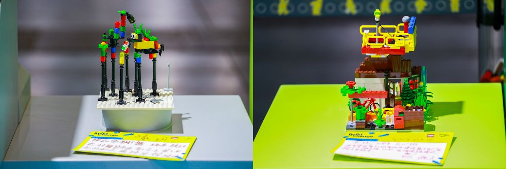 展台上还展出了乐高集团“Build the Change小小创变家”项目中孩子们关于可持续未来的创意作品。该项目旨在邀请儿童针对真实世界里环境或社会相关的挑战,发挥想象力和创造力表达自己的想法,并采取行动。