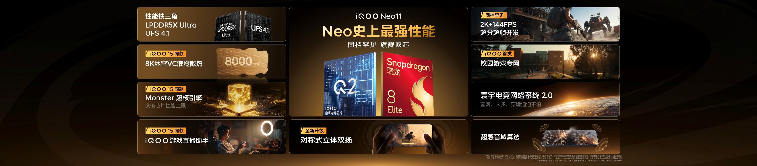 iQOO Neo11 搭载由骁龙 8 至尊版与自研电竞芯片 Q2 组成的“旗舰电竞双芯”,并在 Monster 超核引擎支撑下,带来优秀的 1% Low 帧表现、全新升级的 PC 级 2K 纹理超分、原生级 144FPS 无损超帧以及超分超帧并发,实现行业领先的游戏视效;更以 8K 冰穹 VC 液冷散热、7500mAh 超薄蓝海电池、AR 增透膜等多项 iQOO 15 同款配置、高质感金属玻璃机身和 IP68 & IP69 防尘防水等,共筑一款更优秀的强悍标准版。