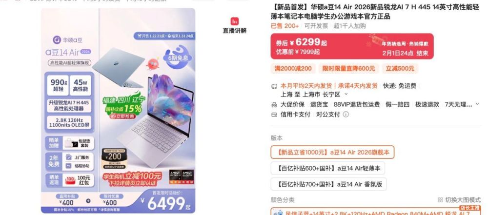 售后保障同样贴心,购机即享a豆无忧服务计划,涵盖2年硬件上门服务、2年无限远程协助、2年好屏无忧换新、2年整机保修服务,日常使用中遇到问题也能得到及时专业的解决方案,入手无后顾之忧。1月22日21:00,天猫现已正式开售,上天猫搜索“华硕a豆14 Air 2026”,直接享受补贴400元,首发限时优惠600元,更有学生购机立减100元优惠,到手券价6299元起,部分地区可以享受15%的国家补贴(详情可咨询客服了解)。