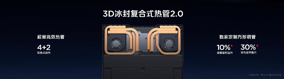 红魔游戏本16 PRO升级魔冷散热架构2.0,从导热、散热多维度优化,确保高负载下机身不发烫、性能不降频。采用3D冰封复合式热管2.0,搭载4+2矩阵式排布的超宽高效热管+独家定制方形铜管,相比传统热管接触面积提升10%,导热效率提升30%,能将核心热量快速散出。配备超大 VC 均热板与超低热阻相变材料,均热能力强且轻薄省空间,持续性能提升 40%。另外还采用了2+1风扇布局的3D冰刃风扇,独家定制旋涡风扇与高强度复合扇叶,风压提升94.2%,整体风量提升61.5%,能快速将散热鳍片上的热量排出机身,避免热量堆积。