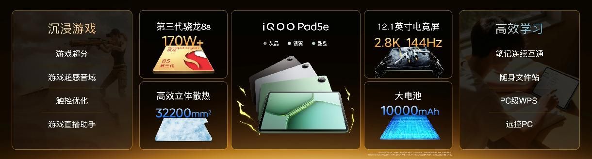 “永劫无间手游和王者荣耀职业联赛双推荐平板”iQOO Pad5e,它搭载第三代骁龙8s、12.1 英寸高清电竞屏、3W+mm² 高效立体散热、10000mAh 大电池,硬实力不虚,游戏超分更是同档断层领先,PC级WPS+ CAJViewer 更是专业生产力升级,学习办公超轻松;iQOO WATCH GT 2 搭载屏占比高达 82.4% 的 2.07 英寸超亮全景屏,局部峰值亮度 2400 尼特,配有 100 多种运动模式,不但可以记录心率、热量等数据,还具备全新电竞模式、接入满血版 DeepSeek 的蓝心小 V 和碰一碰遥控器,33 天超长续航,更是做到全天候健康监测;iQOO TWS 5 全链路游戏延迟低至 42ms,四麦自适应降噪,降噪深度飙至 60dB,拿下 A+ 级 CAIA 降噪能力认证,并有升级的 Monster Sound 电竞声效和 48 小时超长续航,体验更好的跨生态无缝三连接和实时智慧翻译,全新主题弹窗,更有 KPL 电竞选手无畏定制弹窗和定制提示音,是专为游戏玩家打造的旗舰降噪耳机。