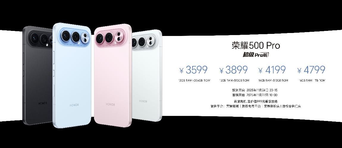 荣耀500系列共带来“海蓝宝”、“星光粉”、“月光银”、“曜石黑”4款水晶配色,售价方面,荣耀500标准版12GB+256GB、12GB+512GB和16GB+512GB版本售价分别为2699元、2999元和3299元;荣耀500 Pro版12GB+256GB、12GB+512GB、16GB+512GB和16GB+1TB版本售价分别为3599元、3899元、4199元和4799元。现已在荣耀商城、授权电商平台、荣耀体验店、授权零售门店开启预售,并于11月27日10:00正式开售,首销购机赠价值999元尊享服务。