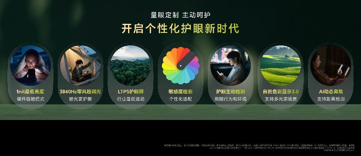 荣耀持续引领行业护眼赛道,荣耀500系列支持九大荣耀绿洲护眼特性,覆盖了自然光的波动、频闪、亮度、节律、光谱和色彩六大视觉维度,还提供了AI离焦护眼、AI干眼友好和晕动舒缓显示三大辅助护眼功能,不仅对于不良用眼行为进行主动提醒,还能智能检测不良环境光源,为用户构建对眼睛更加友好的居住和办公环境。
