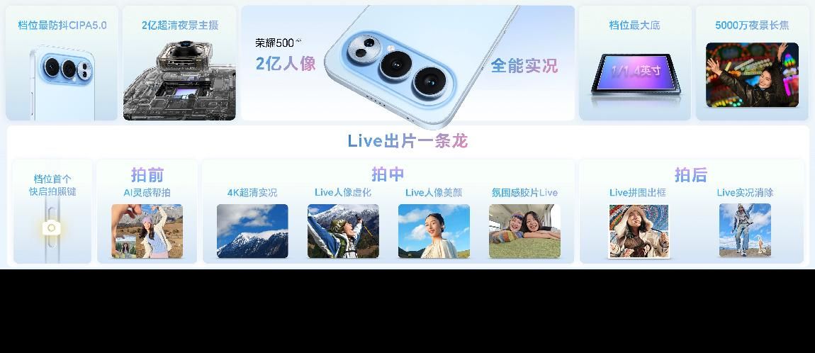 荣耀500全系延续2亿AI超清人像基础,配备档位最大1/1.4英寸大底传感器及1200万超广角镜头,荣耀500 Pro还带来5000万双防抖长焦镜头,支持CIPA5.0旗舰级防抖等级,无论面对手抖还是复杂光源,都能保证成片清晰度和曝光效果,从而带来档位超稳、超清晰的影像拍摄能力。