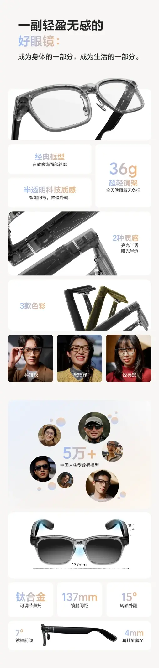 外观上,Livis在经典框型基础上微调了眉部与鼻梁曲线,进一步修饰脸型。半透明镜框呈现若隐若现的内部结构,彰显科技美感。搭配车规级G3曲面设计,整体线条更流畅,质感更突出。