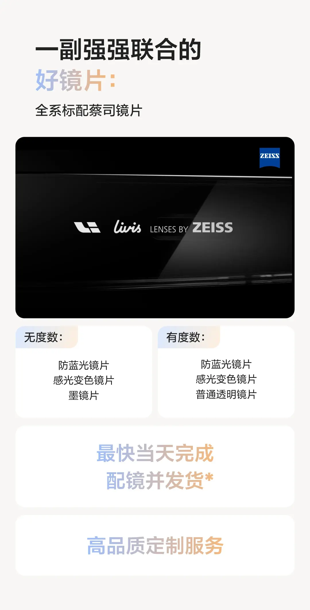 理想AI眼镜 Livis全系标配蔡司高品质镜片,覆盖平光、防蓝光、感光变色及屈光近视/远视镜片,满足日常配戴与驾驶需求。通过与蔡司的战略合作,理想为用户提供高品质光学配镜,让高端体验触手可及。