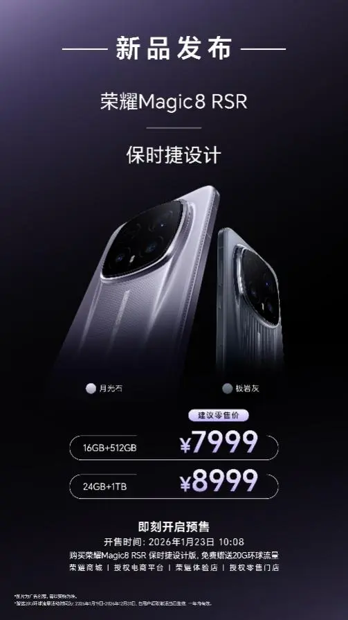荣耀Magic8 RSR 保时捷设计提供“月光石”与“板岩灰”两种专属配色,推出24GB+1TB、16GB+512GB两种存储版本。新机将于即刻开启预售,并于1月23日10:08分在荣耀商城、各大授权电商及荣耀体验店正式开售,售价为7999元起。购买荣耀Magic8 RSR保时捷设计版,还将获赠20G环球流量,领取激活一年内有效。