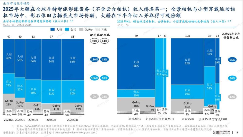 报告显示,2025年全球手持智能影像市场(含运动相机、全景相机、小型穿戴相机)迎来爆发,全行业收入同比增速达到96%。这一增长背后,是主流品牌密集的新品发布:大疆在三类相机上均推出新品,影石持续迭代旗舰机,GoPro亦重返全景赛道。丰富的产品供给,叠加滑雪、骑行等户外运动的持续火热,共同激活了消费需求。