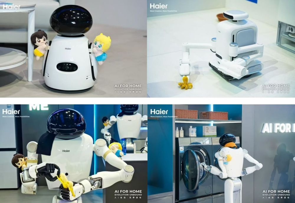 海尔在AWE2026现场展示的陪伴机器人(上左)、清洁专用机器人(上右)和通用型机器人(下左和右)