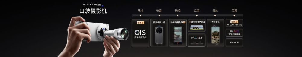 创作自由不只属于静态影像,为此vivo X300 Ultra视频能力再度升级。不仅全焦段视频高规格,而且全焦段视频好画质。防抖方面,全焦段OIS光学视频防抖,其长焦3°OIS光学防抖能力,即使装上增距镜拍摄,依然稳定出片。收音方面,四麦收音大师,支持6大场景化收音预设,一键获得高质量的收音,还可以连接专业的无线麦,实现收音自由。在监看上,2K蔡司大师色彩屏作为取景器,全场景取景和监看时色彩更真实;参考专业电影摄影机全新推出的专业录像模式Pro,参数布局清晰,调节更便利,一键清屏功能只需轻点屏幕,便可沉浸式构图;开放的自定义3D Lut导入监看功能,让用户可以将常用的调色LUT直接加载进取景器,拍摄时就能预览最终的电影色调。在回放上,全新升级的大师双扬,上扬净腔体积提升至270%,堪比电影级声场。最后也是最重要的一步,在后期方面,全焦段4K 120fps 10bit Log,422采样,APV帧内编码,完整将色彩和影调的决定权交给后期;同时vivo Log已适配ACES专业后期流程,让Log素材能与专业电影摄影机素材在同个色彩空间协同调色,无缝对接影视制作体系。此外,还可直接在相册中预览、烧录3D Lut,vivo摄影App还内置3D Lut库,定期更新风格化预设,让用户轻松获得独特的调色风格。V单真正打通了从拍摄到后期、完整可控的专业视频创作工作流,当用户在观看演唱会或体育赛事时,抬手就能拍出转播级画面。